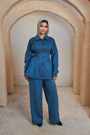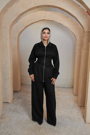 A fitted zip-up jacket paired with wide-leg pants, offering a clean, modern, and effortlessly stylish look.