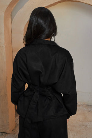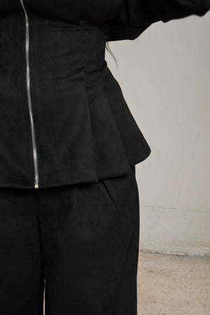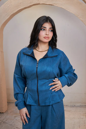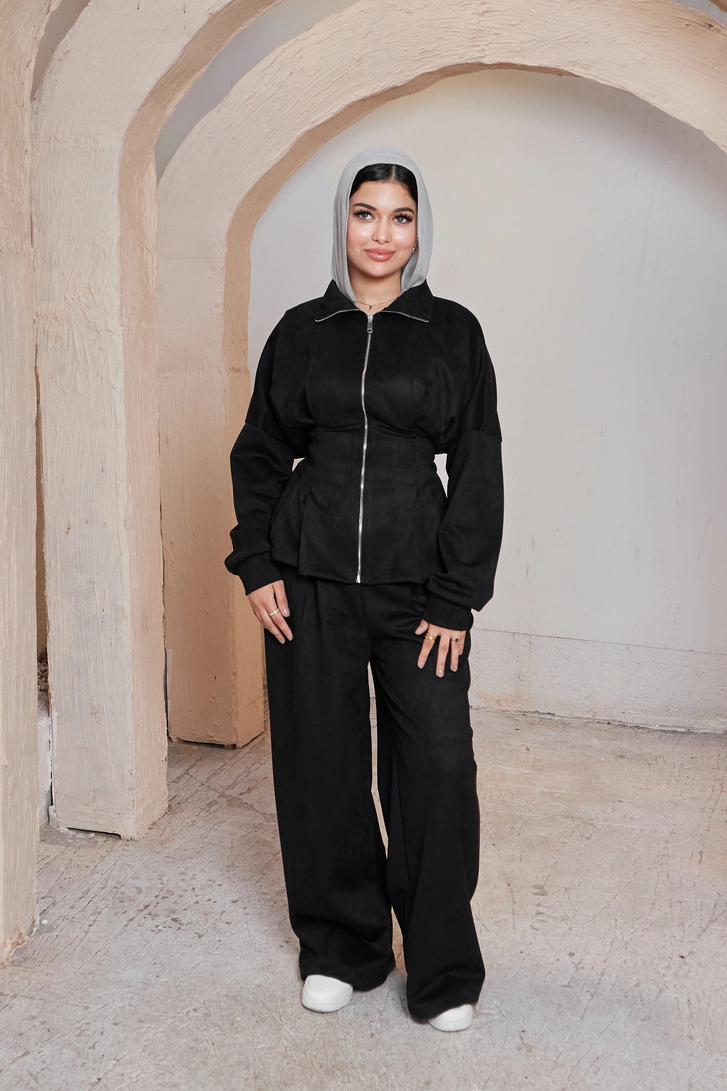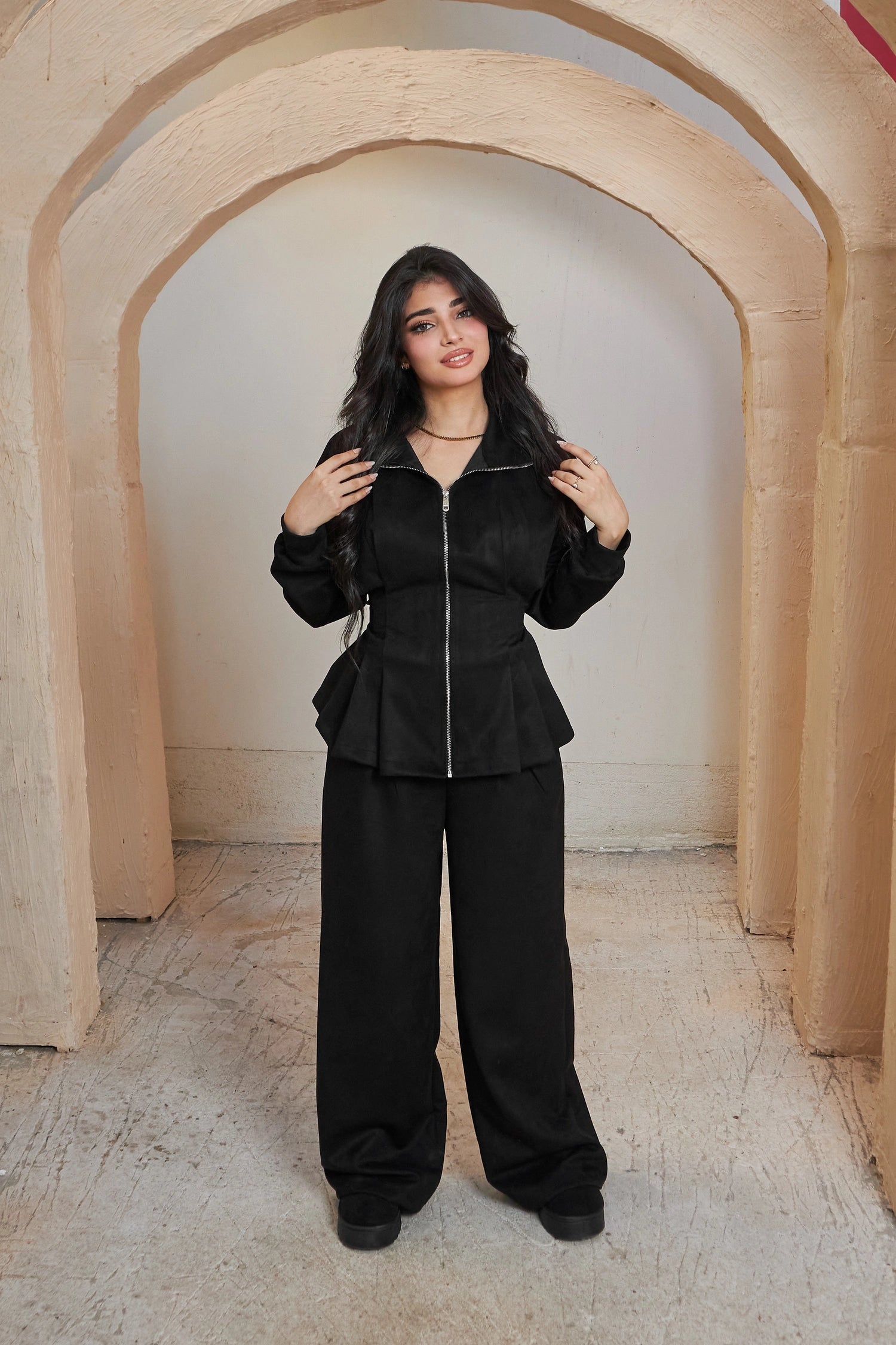 A fitted zip-up jacket paired with wide-leg pants, offering a clean, modern, and effortlessly stylish look.